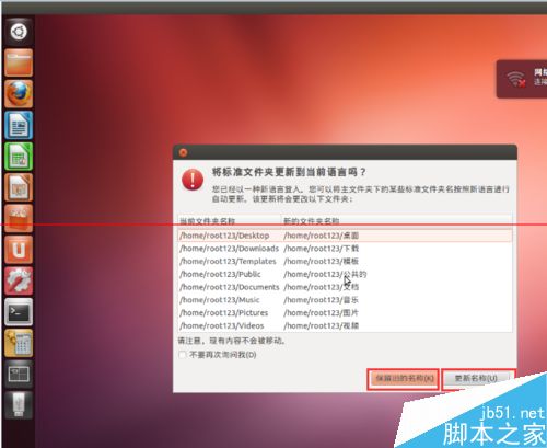 7、在重啟之后,我們會(huì)看到,有一個(gè)詢問的對(duì)話框,問你是否將標(biāo)準(zhǔn)文件夾更新到當(dāng)前語言,這里按照個(gè)人喜好而定”。我們這里也已經(jīng)看到,系統(tǒng)語言已經(jīng)由English修改為了漢語。至此,完成了系統(tǒng)語言的更換