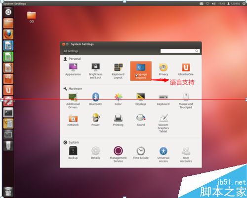 1、首先,我們打開Ubuntu桌面左側(cè)工具欄中的”系統(tǒng)設(shè)置”