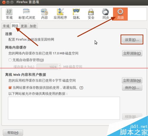 7、在【firefox首選項】對話框中,依次點擊【高級】-【網絡】-【設置】