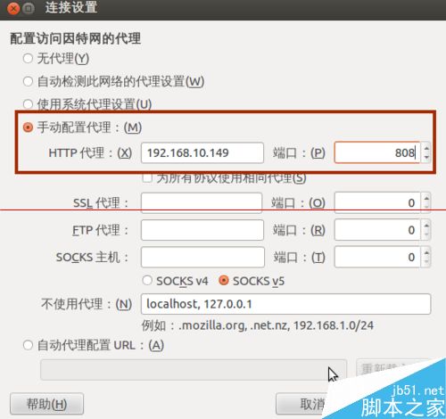 1、依次操作上述第5,6,7三個步驟后,在【連接設置】對話框中,選擇【手動配置代理】,然后輸入你的代理服務器IP以及端口,最后確定。