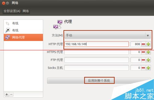 4、代理【方法】選手動;【HTTP代理】輸入你的代理服務器IP以及端口。然后【應用到整個系統】