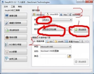 5、類型選GRUB 2,驅(qū)動(dòng)器選擇自動(dòng)定位和加載,然后點(diǎn)擊添加條目