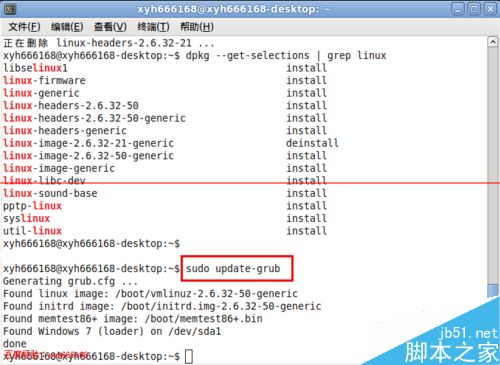 9、 雖然在卸載舊內(nèi)核的時(shí)候提示信息說(shuō)已經(jīng)幫我們更新了系統(tǒng)啟動(dòng)項(xiàng),但為了保險(xiǎn)起見我們執(zhí)行sudo update-grub更新開機(jī)啟動(dòng)控制文件。