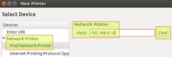 1) “Add”按鈕將彈出 "New Printer" 菜單。我們將選擇"Network printer" -> "Find Network Printer"并輸入我們服務器的IP地址,接著點擊"Find":