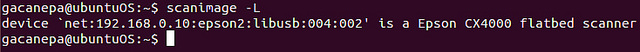 1)讓我們第一步來檢查在我們的Ubuntu客戶端主機上是否存在一臺可用的掃描儀。沒有先前的安裝,你將會看到信息提示"沒有識別到掃描儀." $ scanimage -L