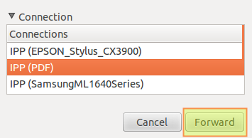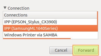 2) 在最下面我們將會看到可使用的打印機的名稱。我們來選擇這臺三星打印機并按"Forward":