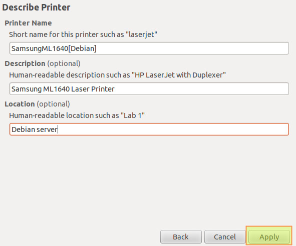 3) 我們將會被要求填寫一些關于我們打印機的信息。當我們輸入完成時,將點擊 "Apply"按鈕。