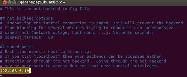3) 讓我們編輯/etc/sane.d/net.conf文件,并在掃描儀安裝后添加服務器IP地址: