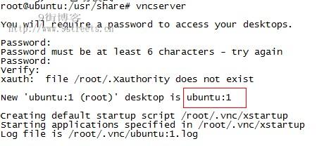 3、啟動vnc4server,輸入vnc4server此時系統會提示你輸入密碼,在通過客戶端鏈接時將會用到這個密碼。