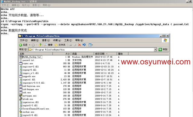 rsync -vzrtopg --port=873 --progress --delete mysqlbakuser@192.168.21.168::MySQL_Backup /cygdrive/d/mysql_data < passwd.txt