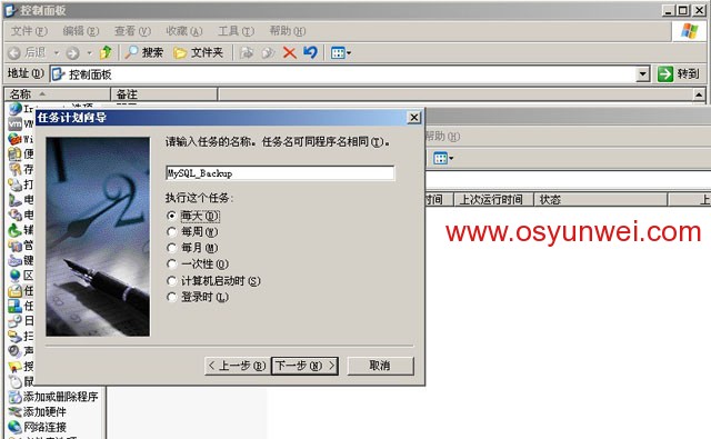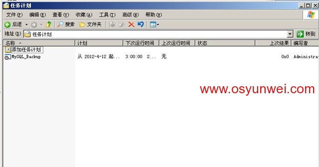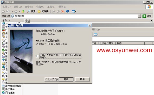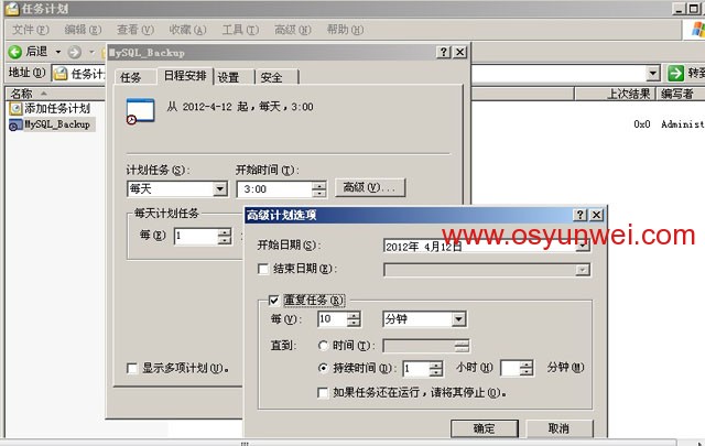 切換到日程安排來選項設置,還可以打開高級來設置每隔幾分鐘運行一次MySQL_Backup.bat這個腳本