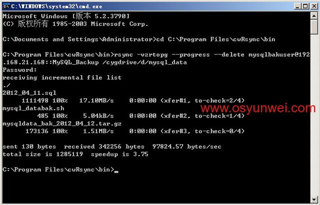再輸入rsync -vzrtopg --progress --delete mysqlbakuser@192.168.21.168::MySQL_Backup /cygdrive/d/mysql_data