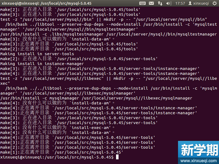 接著開始編譯MySQL,在mysql-5.0.45目錄下鍵入“sudo make && make install clean”。