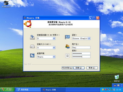 點擊“在Windows中安裝”,將出現安裝設置對話框。請選擇一個擁有足夠空間的分區,分區格式需要是NTFS的,如果安裝大小選擇4GB,則推薦有 5G以上空閑空間。這里選擇安裝在D盤。在系統安裝完畢后,Ubuntu實際上就位于D:/Ubuntu中。安裝大小的設置可根據實際情況確定,這里選擇 4GB。安裝大小決定著Ubuntu系統分區的大小。如果空間允許,這里可以設置的大一些以便日后在Ubuntu中安裝更多軟件。再設置下用戶名和密碼。 其他保持默認即可。點擊安裝,就開始安裝系統了。