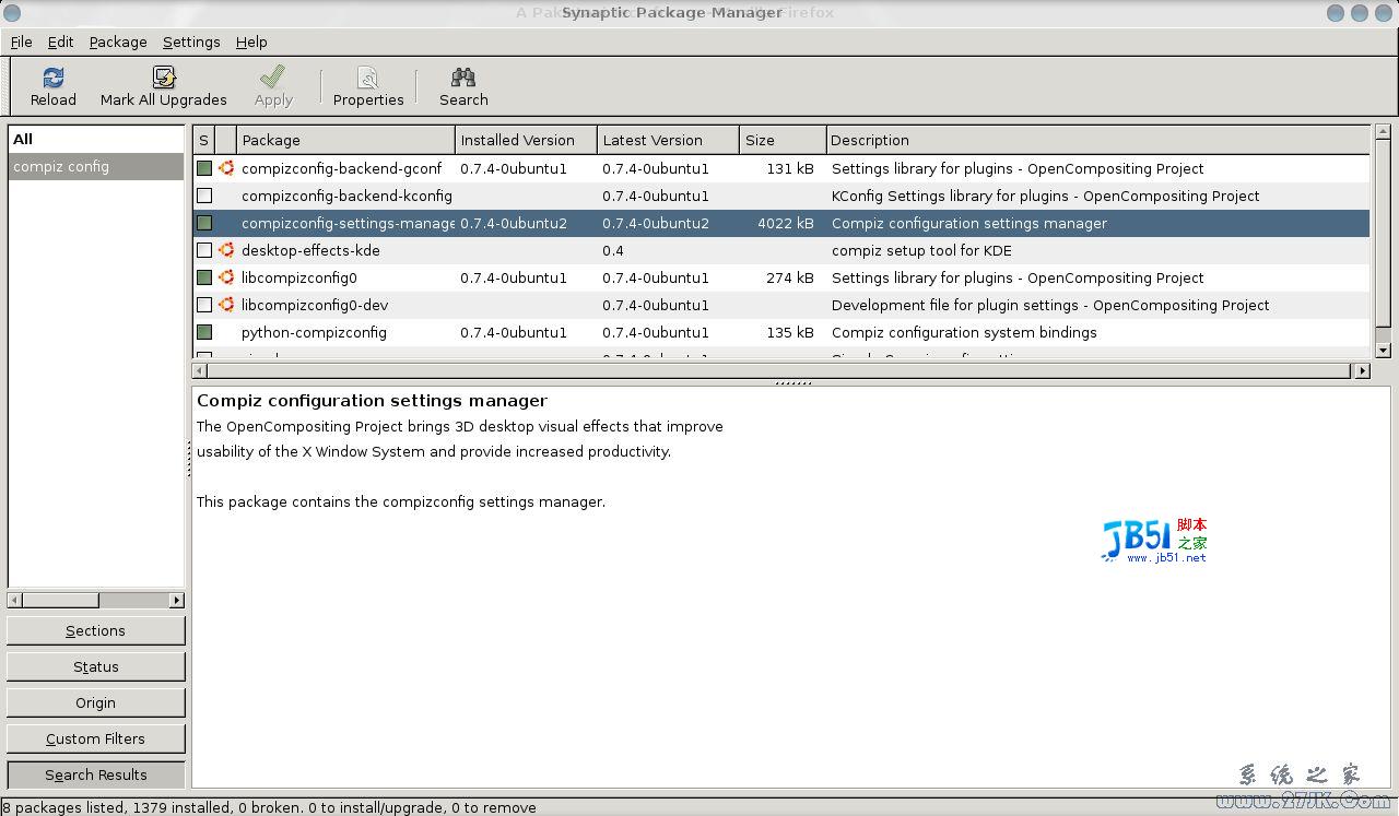 Ubuntu 8.04 ( Hardy Heron ) 是完全支持 Compiz Fusion所有特性的一個版本.但是主要的問題是沒辦法來配置這些特性.為了配置這些不同的選項,我們需要使用一個叫 Compiz Config的工具軟件.打開新立得管理器,搜索 Compiz Config 然后安裝就可以了.