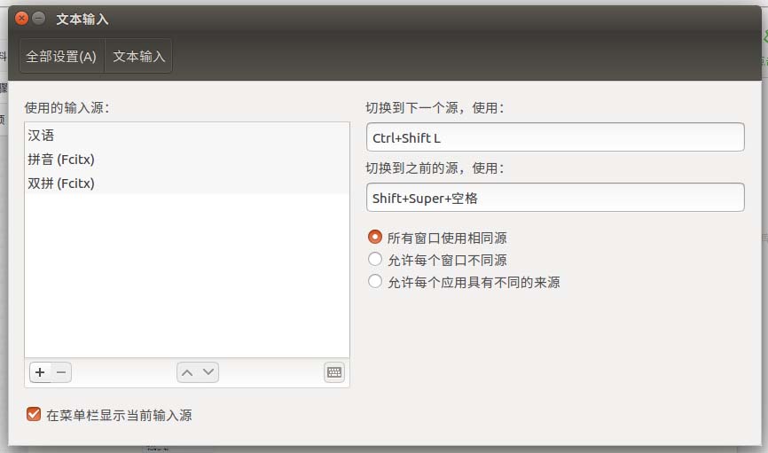 1、安裝語言為中文時默認也會安裝中文輸入法。通過設置"文本輸入設置"中的"切換到下一個源"的快捷鍵,這樣就可以像windows那樣通過ctrl+shift在輸入法間快速切換了。下方還可以選擇適用范圍。