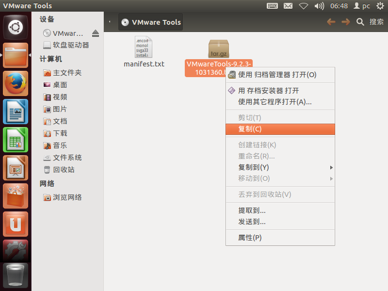 2、之后Ubuntu會(huì)彈出一個(gè)已經(jīng)加載好的光盤(pán)設(shè)備。直接對(duì)光盤(pán)中的tar.gz復(fù)制到/tmp,這個(gè)文件夾,裝完重啟后里面的內(nèi)容會(huì)消失,反正安裝文件留來(lái)也沒(méi)用了。