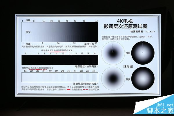4K電視影調(diào)層次還原測試圖中,21級灰階可清晰分辨,不會出現(xiàn)跳階、并階的狀況,漸變過度圓滑柔和。層次分布區(qū)塊灰階可以清晰分辨,暗部細(xì)節(jié)和亮部細(xì)節(jié)標(biāo)注處能隱約可見。屬于較好狀態(tài)水準(zhǔn)。256級灰度測試中,展現(xiàn)出了小米電視5 Pro出色的灰度還原能力。