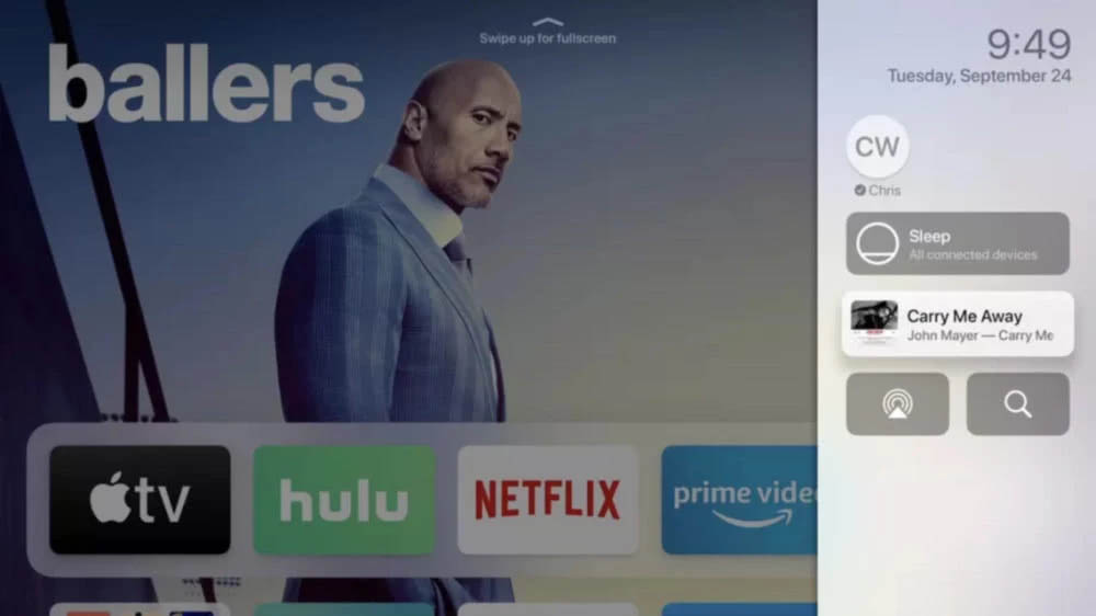 按住Apple TV遙控器上的“TV”按鈕,就會(huì)打開一個(gè)經(jīng)過全新設(shè)計(jì)的“控制中心”菜單,新菜單會(huì)從屏幕的右側(cè)滑出。在Apple TV上,控制中心可以顯示時(shí)間、日期,并且可以在不同的用戶配置文件之間進(jìn)行切換,而且還提供了睡眠模式、播放和搜索等功能的快捷開關(guān)。與iOS和iPadOS不同的是,我們無法在控制中心根據(jù)自己的喜好定制或添加其它功能。不過也許在明年的tvOS上可以實(shí)現(xiàn)。