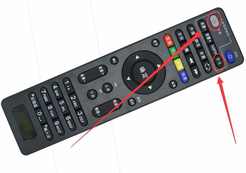 長按機頂盒遙控器上的學(xué)習(xí)按鍵約3秒鐘,提示燈長亮,接著按下機頂盒遙控器上的電視機電源按鍵,準備接收電視機遙控器發(fā)出的信號。