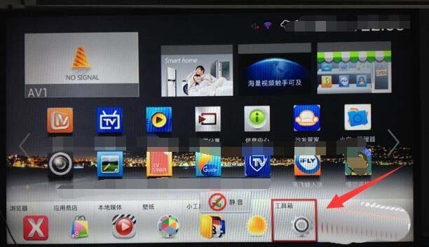 2、電視機進入首界面,按遙控器的方向鍵,選擇電視右下角的工具箱按OK鍵進入設置界面,如下圖所示