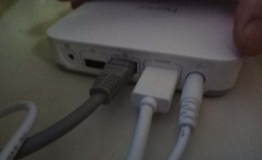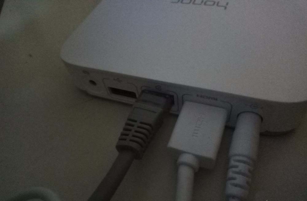 1、首先,把HDMI線,網線,電源線,分別插入盒子的三個接口,如圖