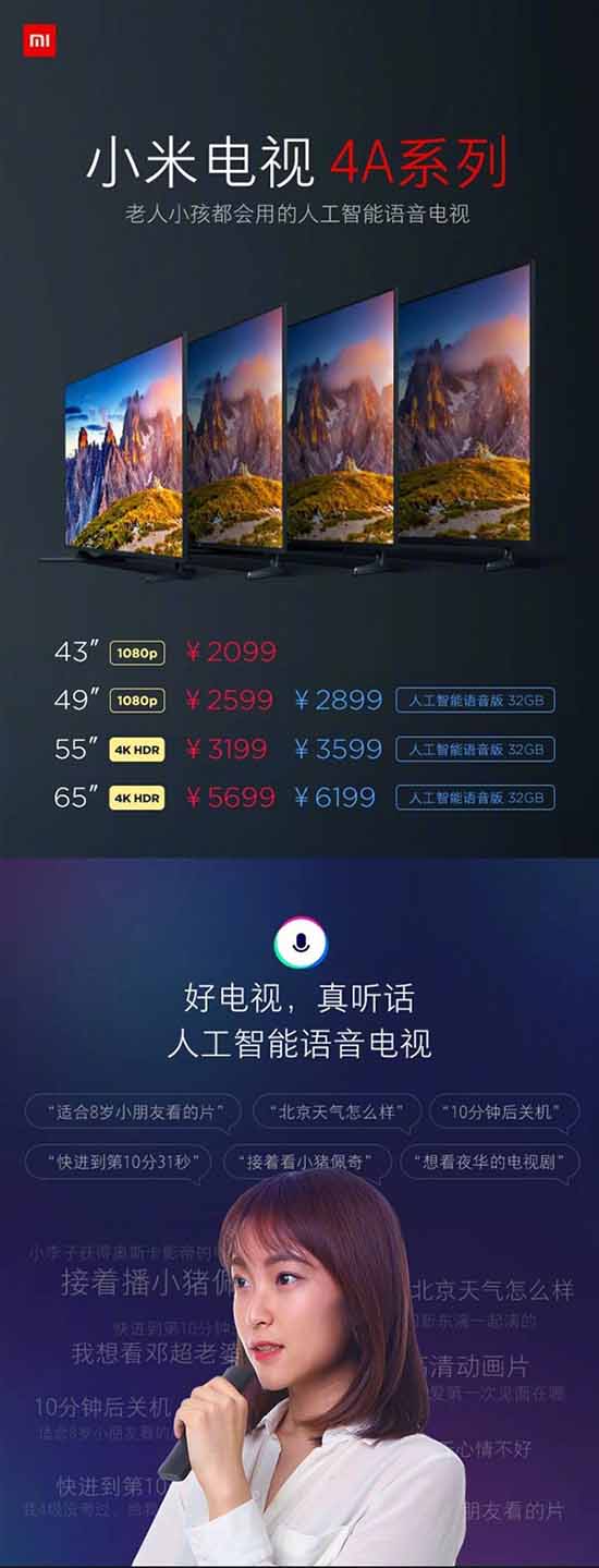 - 65寸4K HDR標(biāo)準(zhǔn)版5699元,人工智能語(yǔ)音版32GB 6199元