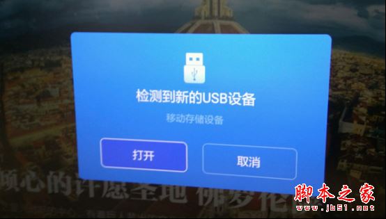 2、把U盤插入到小米盒子的USB接口,看到彈窗之后,選擇“打開”選項(xiàng):