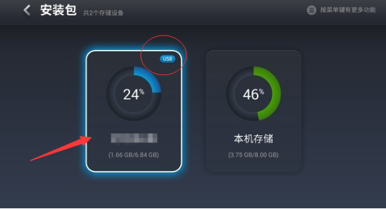 如下圖的提示,點擊“文件管理”之后,打開“安裝包”,找到U盤: