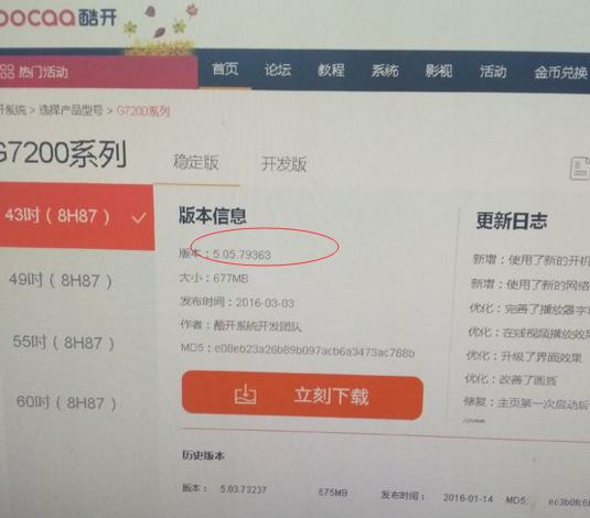 登錄酷開社區,根據自己的電視型號,下載5.05版本的系統包,然后轉移到U盤: