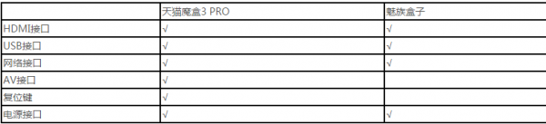 從接口方面的對比來看,天貓魔盒3 PRO依舊獲得了勝利,相比魅族盒子多出了AV接口與復位鍵,這也顯示了天貓魔盒系列經過了多代的積累更加能夠了解到用戶的使用需求。AV接口更好的滿足了老電視用戶的需求,而復位鍵也能夠很好的幫助用戶解決遇到的不能開機或系統故障等問題。