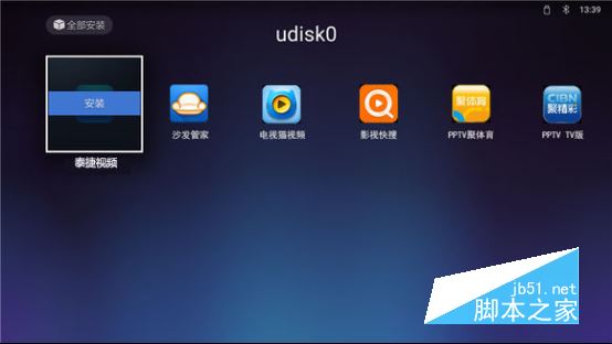萬一盒子沒有自動識別U盤,請打開主界面的“應用”,進入“多媒體播放”,找到U盤并打開,也能找到泰捷視頻安裝文件,安裝完成即可使用: