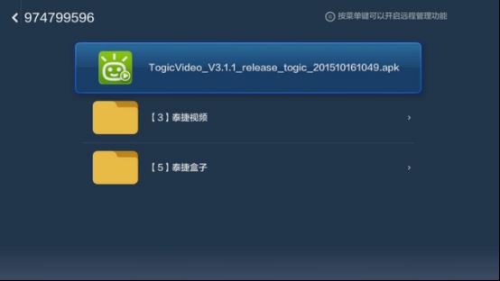 3、選中文件之后,點擊遙控器確認鍵,進行安裝,安裝完成之后,就能在小米電視首頁找到泰捷視頻,觀看高清電視直播了。