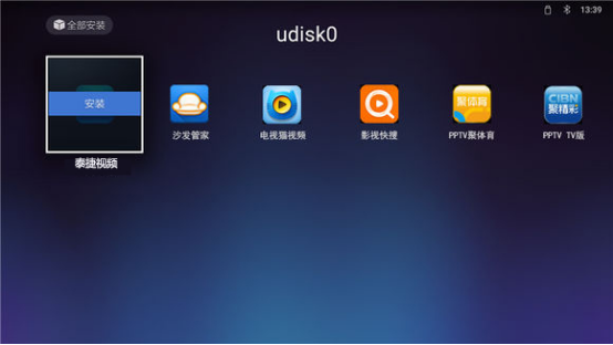 萬一盒子沒有自動(dòng)識別U盤,請打開主界面的“應(yīng)用”,進(jìn)入“多媒體播放”,找到U盤并打開,也能找到泰捷視頻安裝文件,安裝完成即可使用: