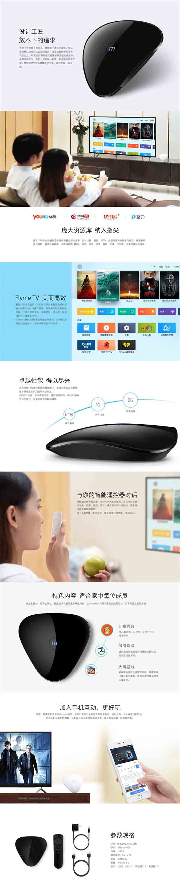 內部配置64位2.0GHz A53四核處理器(五核Mali-450 GPU)、1GB內存、8GB存儲,操作系統是基于安卓6.0的Flyme TV。