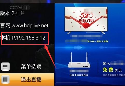 2、通過自己使用的直播軟件,獲取本機IP,下圖為HDP的相關頁面,在打開應用的前提下,按遙控器返回鍵,便能看到本機IP(如下圖):