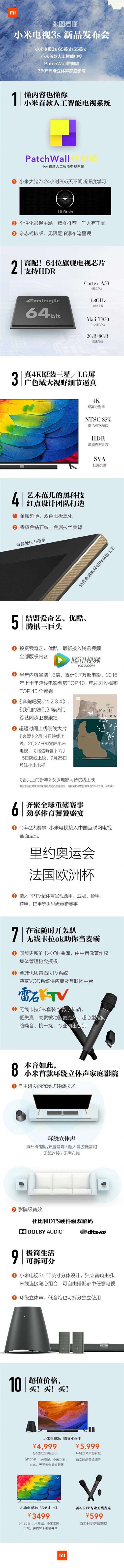 現(xiàn)在,小米送上了一圖看懂小米電視3S新品發(fā)布會,詳盡無遺漏地介紹了新品細節(jié)。此次,3S主打人工智能電視系統(tǒng)(PatchWall拼圖墻),64位四核A53處理器,原裝三星/LG 4K屏,超薄拉絲,結(jié)盟愛奇藝、優(yōu)酷、騰訊三大內(nèi)容商等。