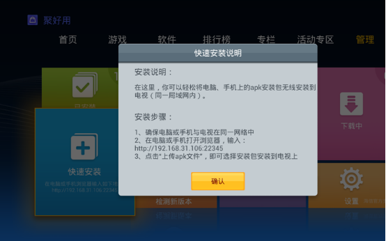 1、本攻略需要一臺與海信電視在同一局域網的電腦,首先進入海信電視的“應用商店”,點擊“管理”欄,選擇“快速安裝”選項: