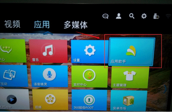 第二步,用遙控器將光標移動到“應用”選項,找到“應用助手”,單擊打開: