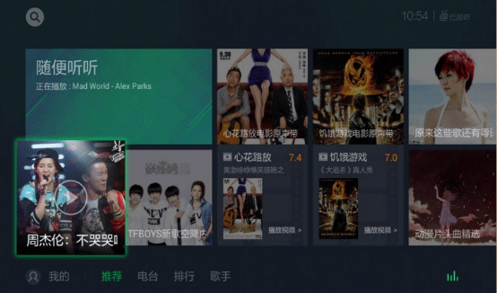 QQ音樂TV版:QQ音樂是由騰訊出品的,現在也在電視端大方光彩,以龐大的音樂庫來得到用戶們的認可,該軟件在歌曲內容上也算是數一數二的了,你幾乎都能在上面找到你想聽的音樂。
