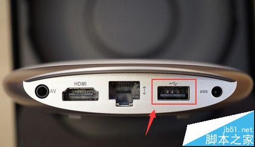 2、然后把u盤插入魔盒背后的usb接口,如圖中箭頭所示,系統彈窗選擇應用進入u盤存儲