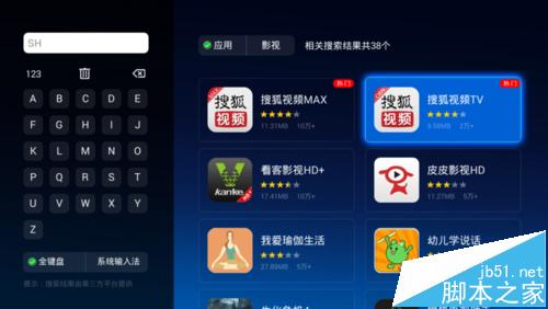 4、搜索輸入SH,找到搜狐視頻TV下載安裝,最后打開就可以了