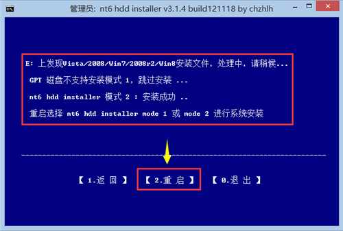 如果你的系統是BIOS啟動和MBR分區架構,那么就會顯示"nt6 hdd install 模式:安裝成功.."和"nt6 hdd installer模式2:安裝成功.."。