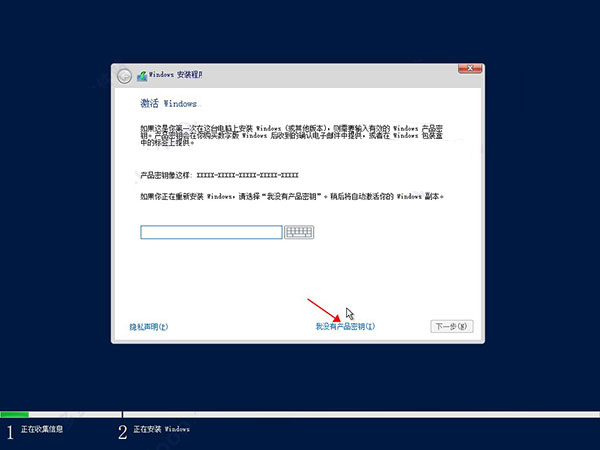 5、秘鑰可以先選擇“沒有產(chǎn)品秘鑰”選項(xiàng),如下圖所示: