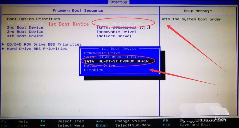 4、選中第一項1st Boot后的選項,按下回車鍵,出現的界面中選擇自己電腦的光驅型號,有DVDROM字樣的一般是光驅。