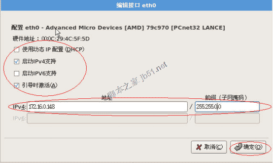 點擊“編輯”,彈出編輯接口eth0界面,去掉“使用動態IP配置(DHCP)”和“啟動IPV6支持”前的勾勾,然后根據實際情況填寫IP地址和子網掩碼,如圖17所示。