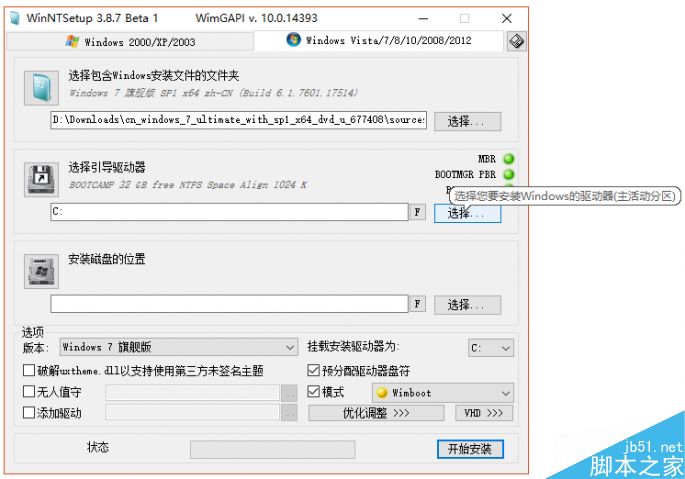 然后設置引導磁盤和安裝磁盤的位置,一般你準備把Windows安裝到哪個磁盤,就設置為哪個盤就可以了。如果你對某個設置項不懂的話,可以把鼠標移動到上面,會彈出提示信息的。