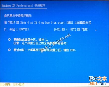 在這一屏中您可以鍵入L鍵,確認刪除C盤分區。(注意,這樣您以前對WINDOWS所作的所有設置都會丟失)如下圖: