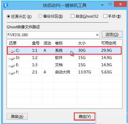 進入快啟動win8pe系統后會自啟快啟動一鍵裝機工具,在工具界面點擊“瀏覽”按鈕,如下圖所示: