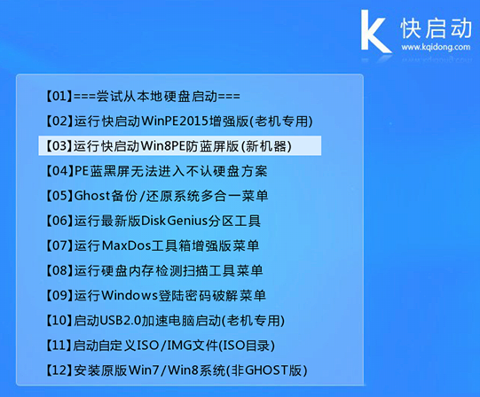 進入到快啟動的主菜單界面后,用鍵盤上的上下鍵將光標移至“【03】運行快啟動Win8PE防藍屏版(新機器)”并回車確定,如下圖所示:
